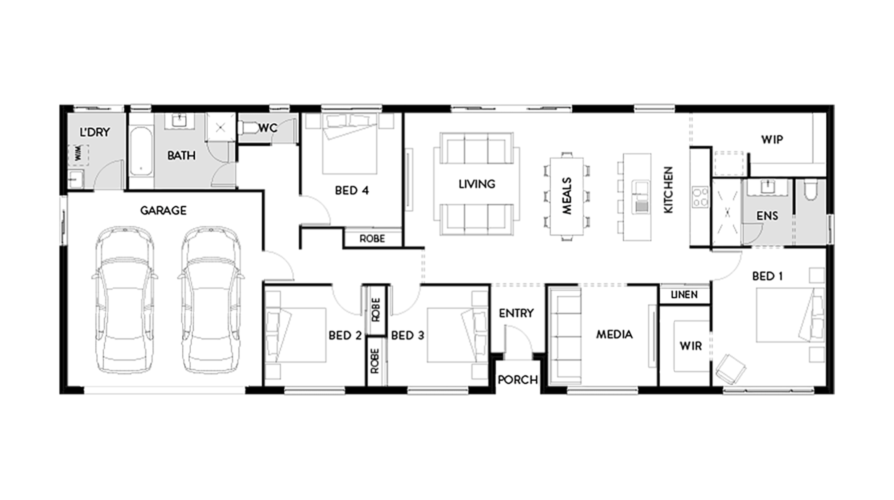 The perfect small acreage home design comes together in the Indiana 199 by Hallmark Homes. The floor plan is designed to make the most out of space for a growing family, with four spacious bedrooms and two bathrooms to suit all families needs. The master suite is a private sanctuary, featuring a large walk-in robe and ensuite. With three additional bedrooms, double garage, large media room and open-plan kitchen and living areas, this impressive small acreage house plan suits anyone who loves a bright, spacious and airy home.